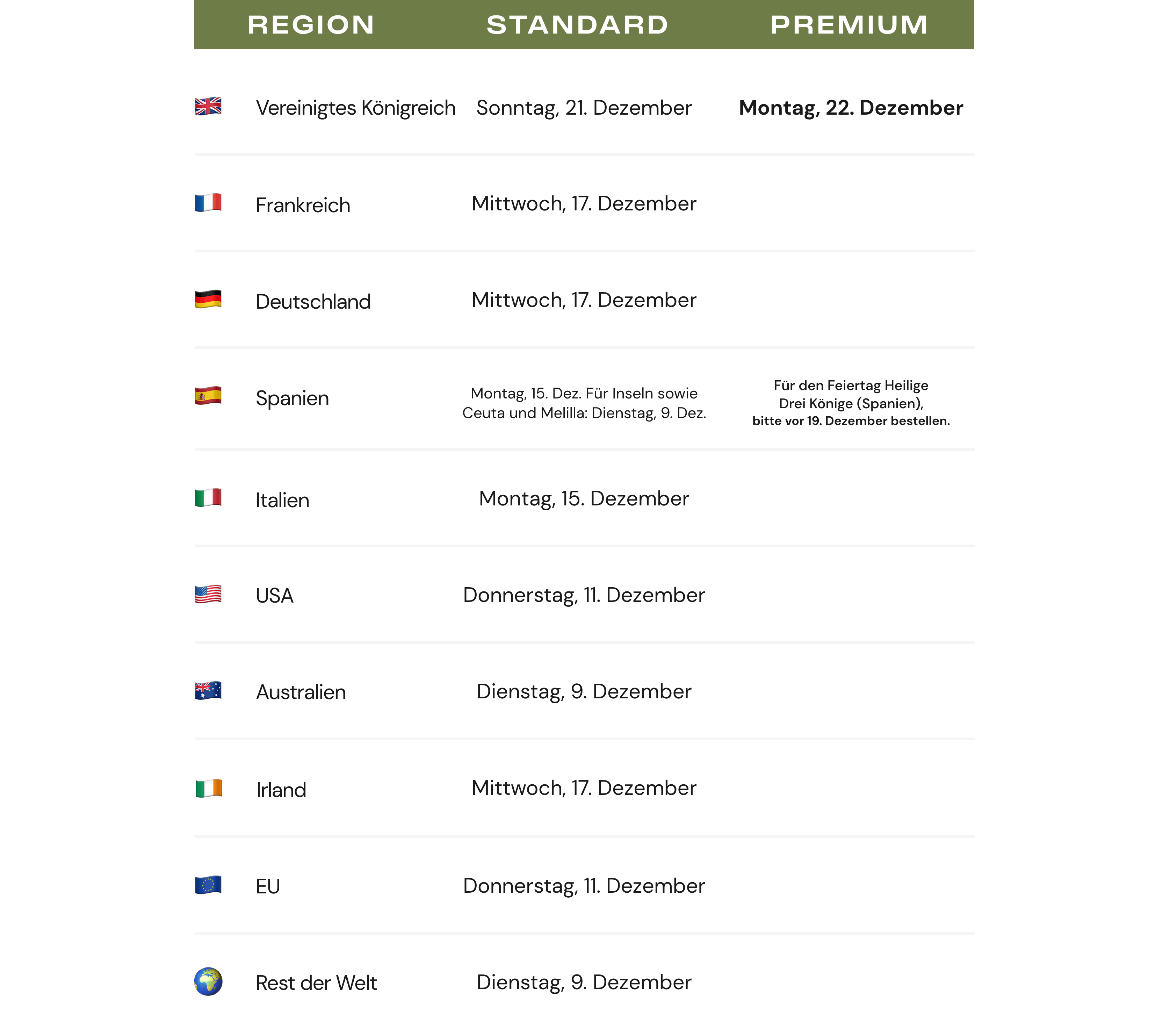 Wir wissen, wie wichtig es ist, Geschenke rechtzeitig zu Weihnachten zu erhalten. Nachstehend findest du unsere Lieferzeiten für Weihnachten und die verlängerte Rückgabefrist.