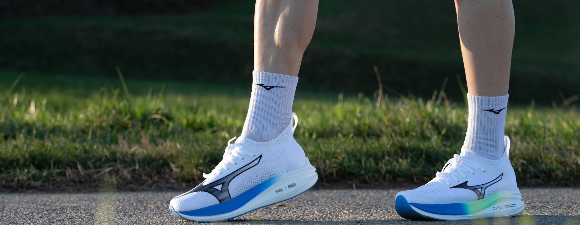 Una vez atadas, la respuesta de la zapatilla se nota inmediatamente, incluso antes de dar un solo paso. El talón está bien protegido, y se puede sentir una inclinación natural hacia adelante. El drop de 6 mm es más pronunciado, gracias a la combinación de espumas en la entresuela, incluyendo la espuma Enerzy Nxt característica de Mizuno.