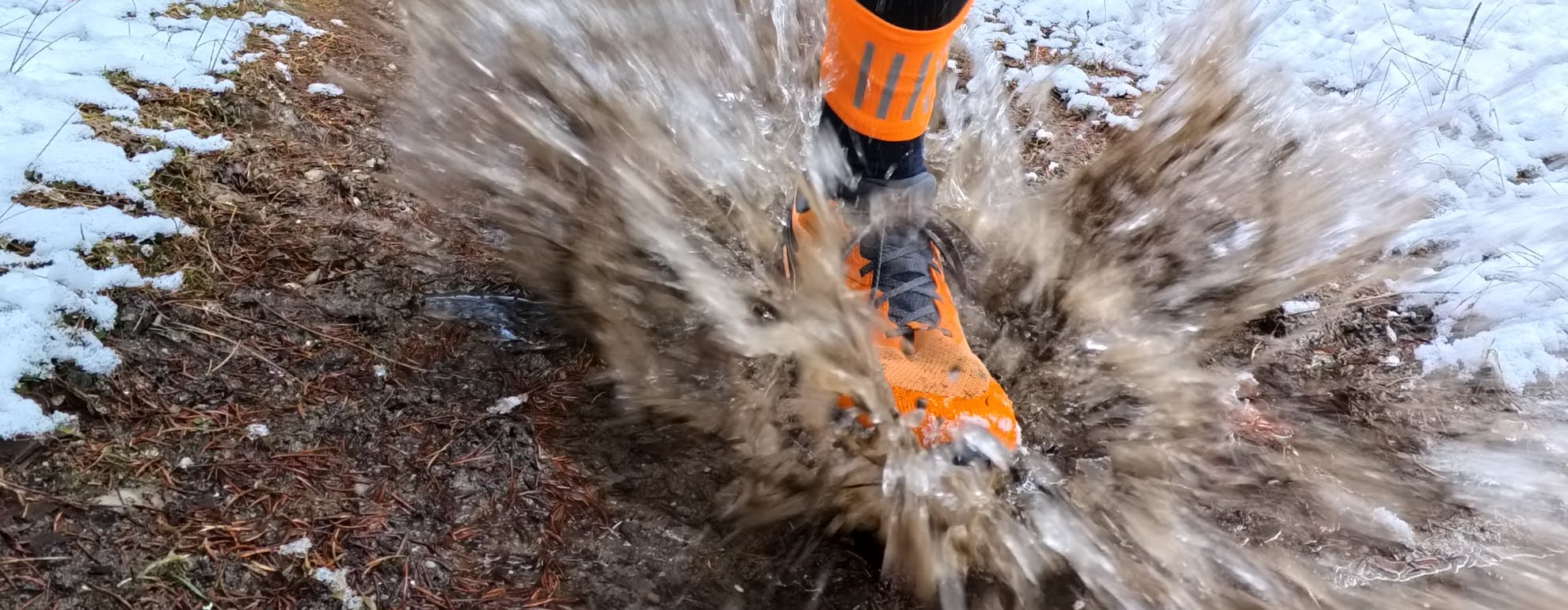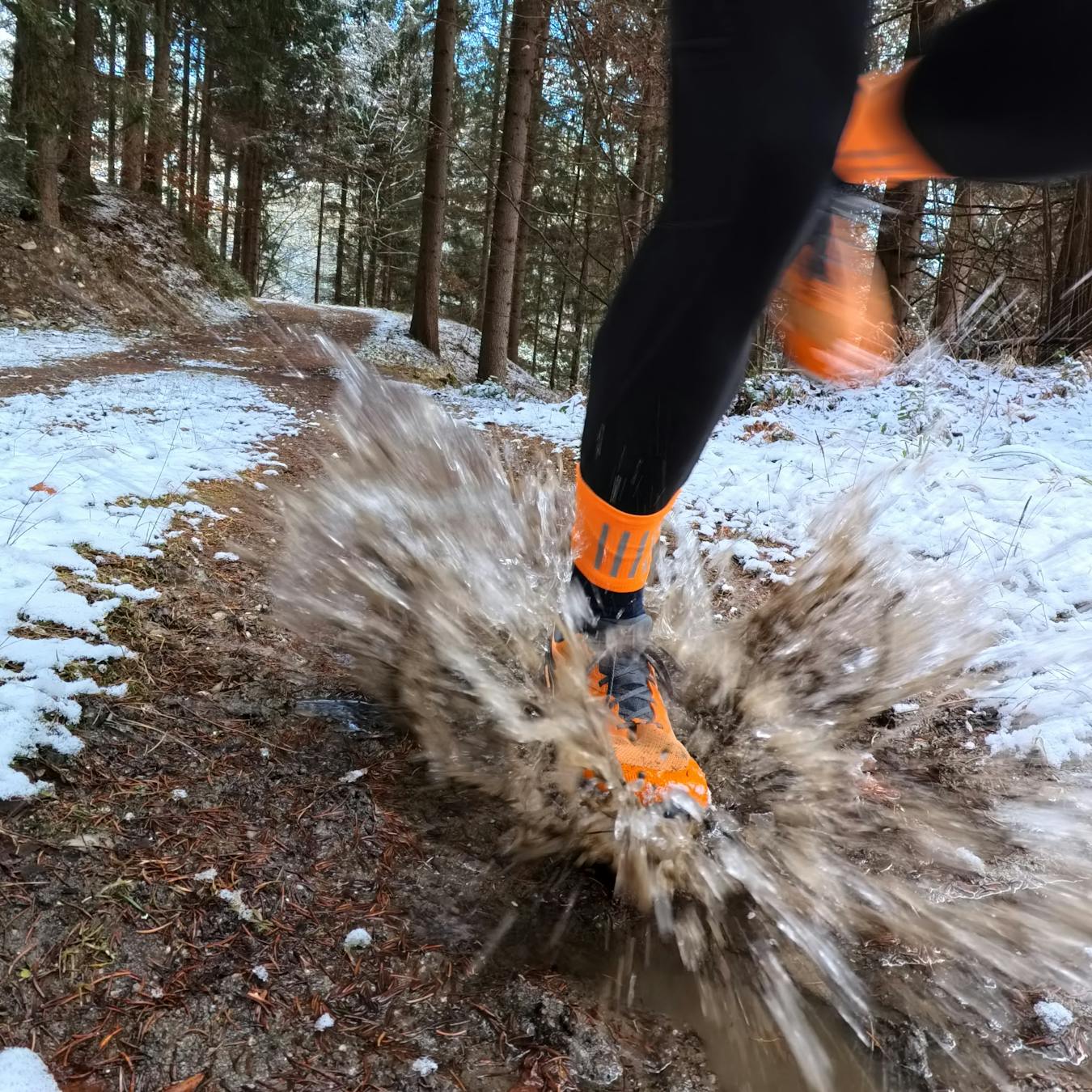 Hay tres unidades tecnológicas principales implementadas en la entresuela: el compuesto principal PWRRUN, la tecnología FormFit y la plantilla PWRRUN+. La plantilla proporciona una gran comodidad desde la primera pisada. La tecnología FormFit contribuye a una sensación de comodidad en la planta del pie y envuelve perfectamente la parte inferior de la suela. Desafortunadamente, estas prometedoras características de comodidad se reducen cuando empiezas a correr, ya que la combinación del compuesto PWRRUN con la capa de protección GORE-TEX hace que la pisada sea muy firme sin demasiada capacidad de respuesta. Aunque estoy de acuerdo con la capacidad de amortiguación en terrenos ligeramente irregulares (no sentirás ningún pellizco de piedras a través de la entresuela), no puedo confirmar una amortiguación suficiente cuando utilizas la zapatilla para distancias superiores a 8-10 kilómetros y/o tramos de bajada. En consecuencia, seguiría recomendando la zapatilla para las clásicas carreras de montaña cuesta arriba, también gracias a su sensación de ligereza en los pies. Pero si eres un corredor de trail que busca una zapatilla de invierno con la que hacer muchos kilómetros, es posible que desees echar un vistazo a otras opciones. Para terminar con una nota positiva, la altura de la plataforma comparativamente baja (28-24 mm) y el drop de 4 mm garantizan una pisada estable.