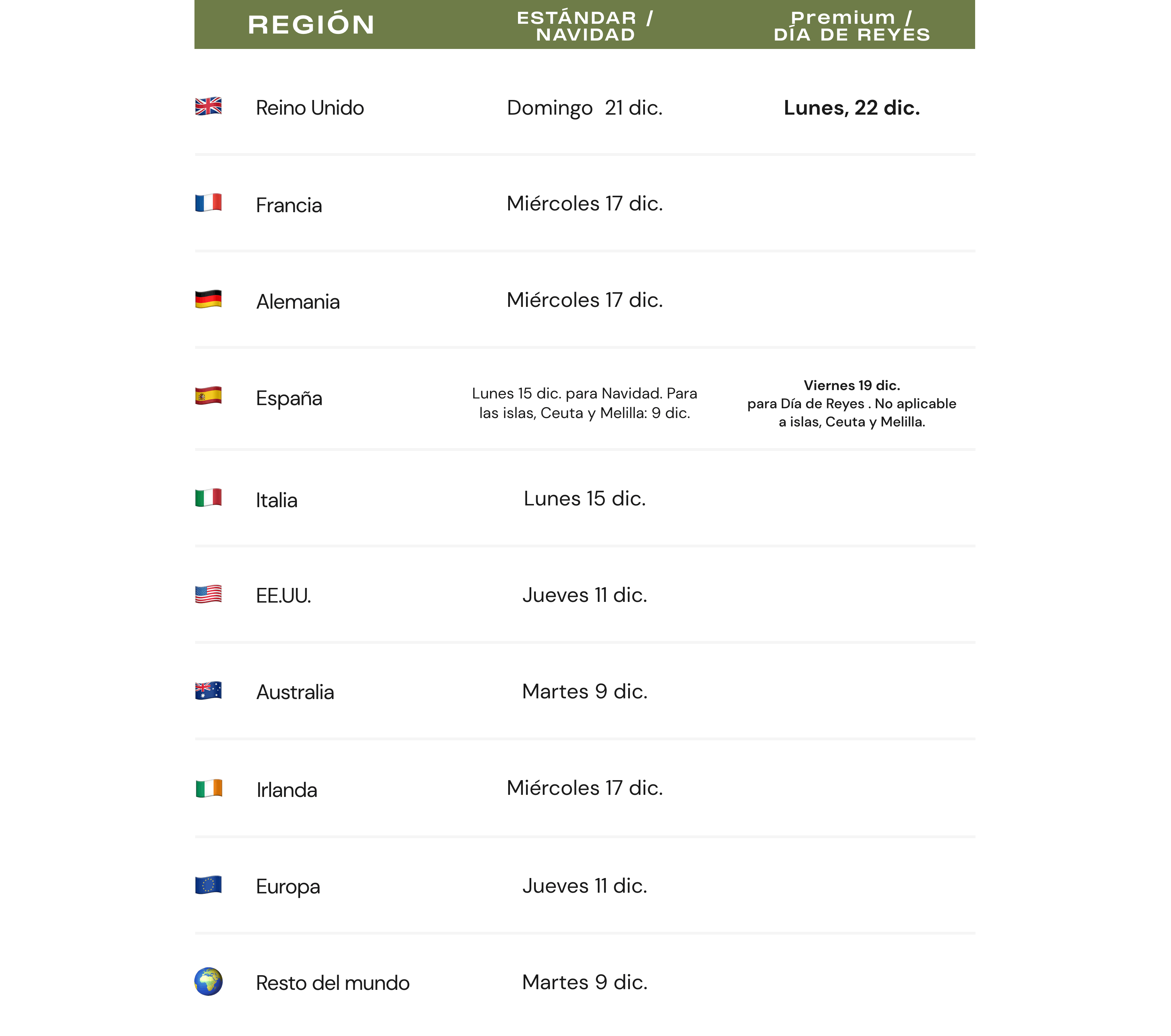 ¿Lo quieres a tiempo para Navidad o Reyes? Recuerda hacer tu pedido antes de las 18:00 h (hora española) en las fechas indicadas en la tabla siguiente.