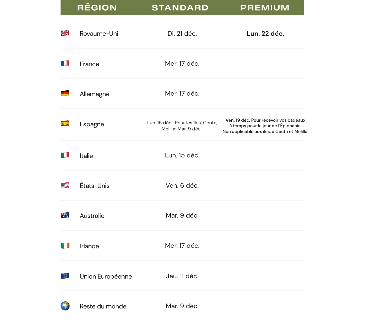 Commandez avant 18 h (heure française) aux dates indiquées ci-dessous pour une livraison avant Noël.