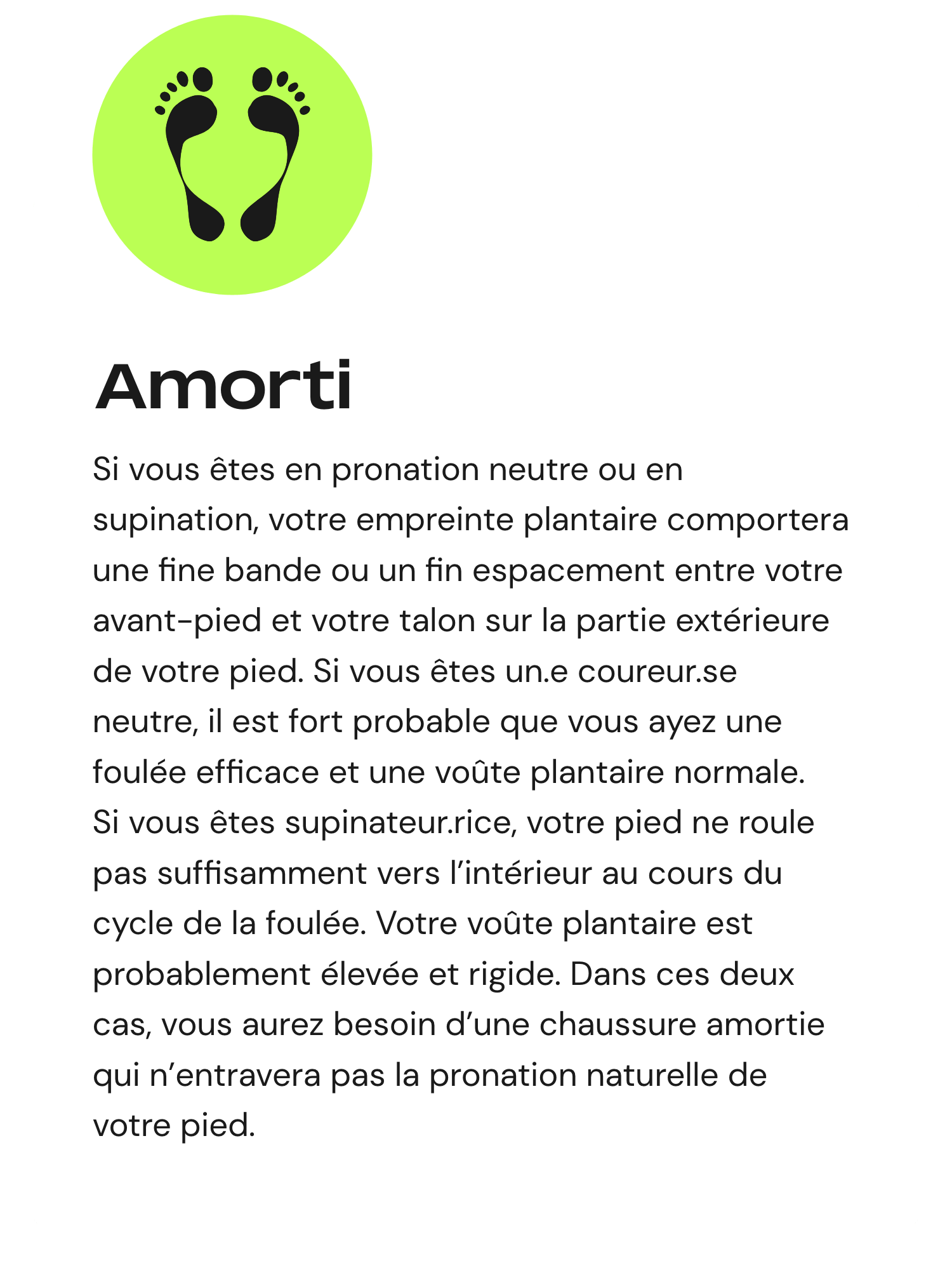La chaussure de running parfaite n'existe pas. La chaussure de running idéale pour vos besoins spécifiques, elle, existe. Au cours du cycle de la foulée, que ce soit lors de la marche ou de la course, le pied opère un mouvement naturel d'un flanc vers l'autre. C'est ce qu'on appelle la pronation. Selon les individus, la pronation peut être neutre, modérée ou sévère.