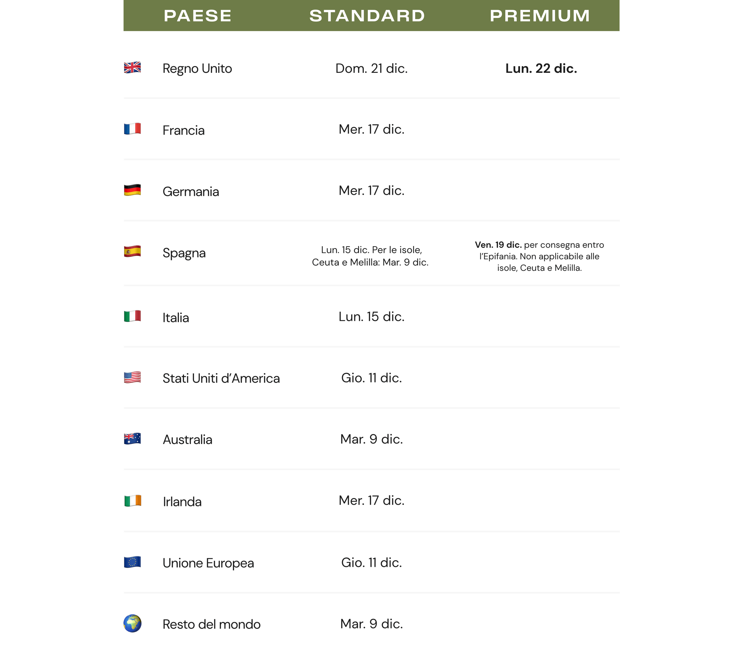 Vuoi ricevere il tuo ordine in tempo per Natale? Ricorda di ordinare entro le ore 18:00 delle date indicate nella tabella sottostante.
